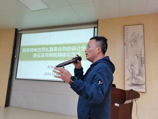 2025年11月4日,学院在求知楼115会议室举办惟勤湖学术论坛系列专题讲座第二十一讲。本次讲座由我院熊裕豪研究员作题为《具有挠电性质钆基氧化物的设计合成、表征及类磷酸酶催化性质》的专题报告。学院教师及全体研究生到场聆听,学院副院长宋慕波主持报告会。