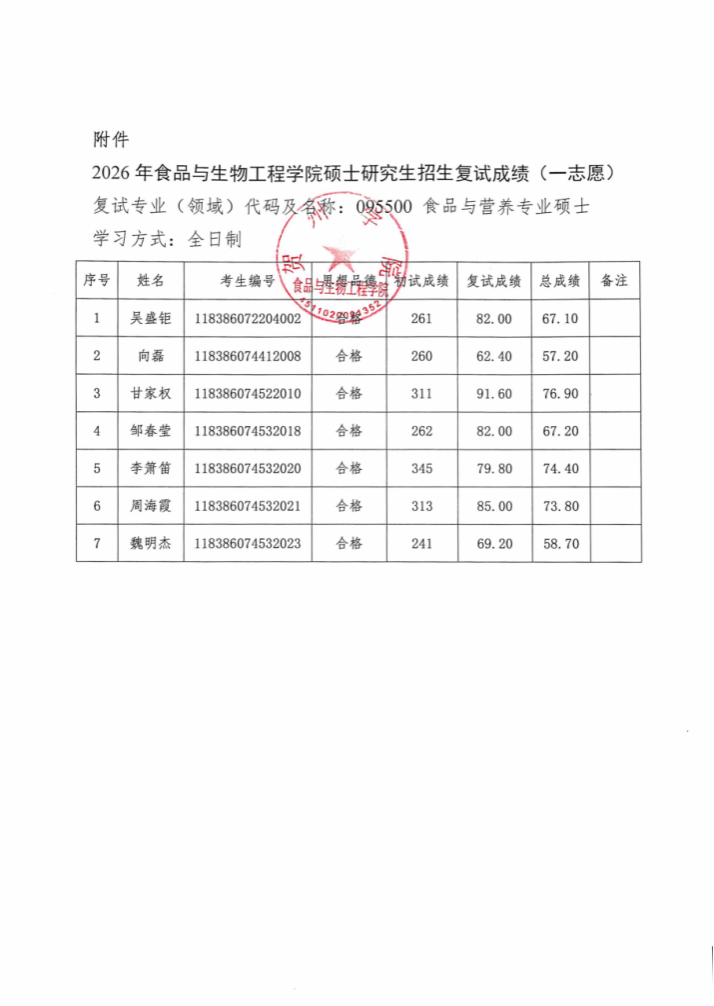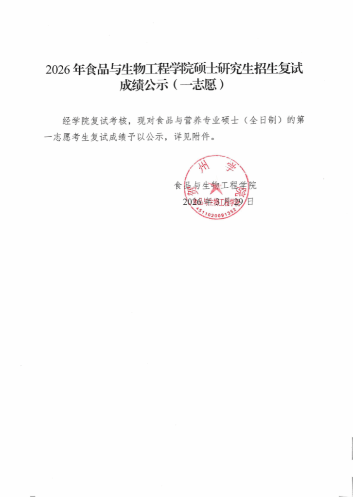 2026年食品与生物工程学院硕士研究生招生复试成绩公示(一志愿)