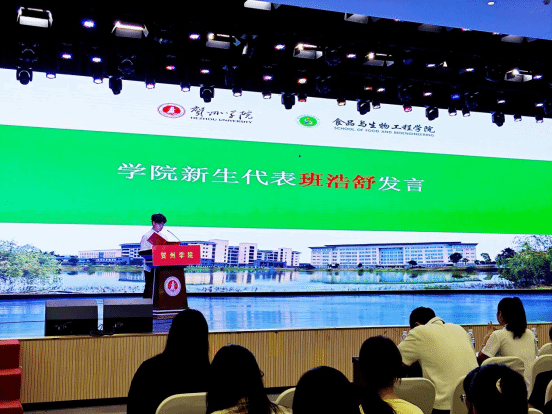 2025级食品科学与工程2班学生班浩舒作为新生代表发言,表达了初入校园的激动与自豪,以及对未来的憧憬。他表示将牢记师长教诲,尽快转变角色,严守校纪院规,刻苦钻研专业知识,积极参与实践活动,努力成长为新时代优秀青年。