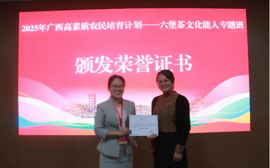 11 月 15 日上午,由广西壮族自治区农业农村厅主办,贺州学院、广西(贺州)六堡茶工匠学院承办的“2025年高素质农民培育计划—— 六堡茶文化能人专题班”第三期培训圆满收官,结业仪式在广西(贺州)六堡茶工匠学院隆重举行。本次培训历时近一个月,共培养来自全区各地的200名六堡茶产业一线从业者,通过系统化教学,为六堡茶产业发展与文化传承注入新的人才活力。学院党委副书记(主持工作)蔡文、副院长宋慕波等领导嘉宾出席仪式,授课教师代表王东、陆国辉、盘大琪及第三期全体学员共同参加。
