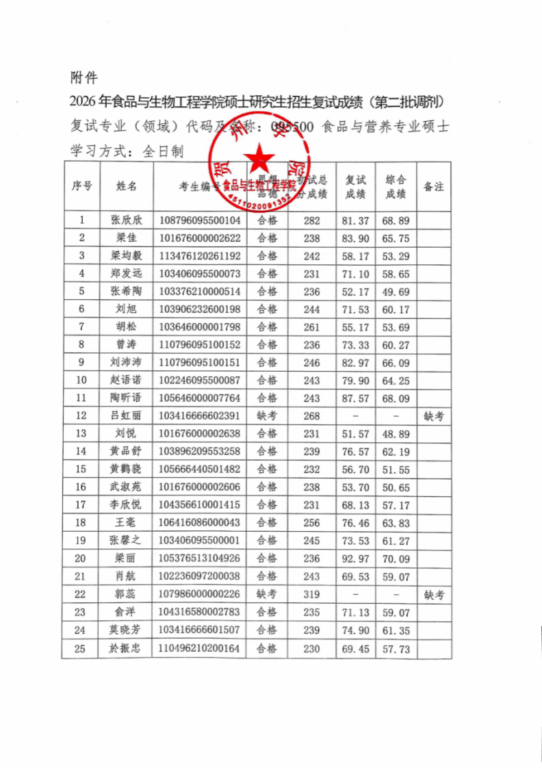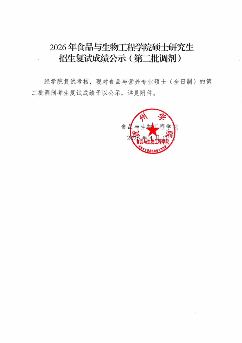 2026年食品与生物工程学院硕士研究生招生复试成绩公示(第二批调剂)